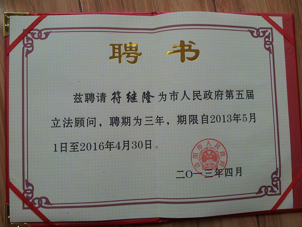 近日,为推动政府决策科学化、民主化、法制化,贯彻落实依法治国基本方略,洛阳市人民政府以【洛政(2013)59号文件】聘请民建洛阳市委市委委员、法律委员会主任、西工总支主任符继隆同志为市政府第五届立法顾问,聘期三年(自2013年5月1日至2016年4月30日),并下发了聘书。